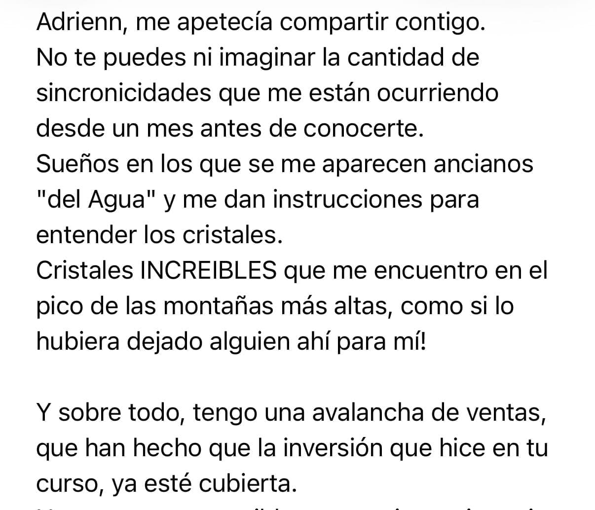 „La primera vez que vi a Adrienn fue en una entrevista con Wisdom from North en YouTube. Después de escucharla hablar sobre su cuerpo de luz y cómo podía vivir sin comida, sentí una fuerte guía para contactarla. Me inscribí en el proceso de preparación y viví algunos de los días más emocionantes de mi vida. Recibí una increíble cantidad de sanación y guía de Adrienn durante este tiempo.